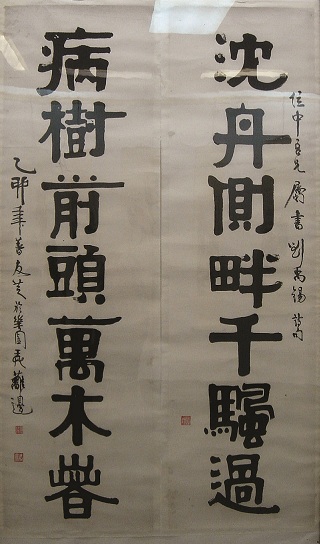 [图-6~7] 章友芝(1917-1983),福州人。善画梅,亦以伊(秉绶)体隶书闻名书坛。他曾凭自己本事考上国民党的闽北将乐县末任县长,后起义投诚,并单身上山劝说当地土匪下山缴械投降,为人民立功而受奖。伊体隶书改传统隶书的”卧势”为”立势”,体势雄浑,个性鲜明,颇显阳刚之气。