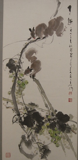 [图-10] 陈明谋(1920-2010),福建德化人。福建师大艺术系教授。擅长中国花鸟画,兼及水彩木刻等。他的画风清新洒脱,佈局有大气,特别重视描绘对象之间的对比、平衡、互动、乃至交流。因此,画面上可爱的小动物,如小鸟、松鼠等,便显得很忙,很能勾起读者的心灵参与。