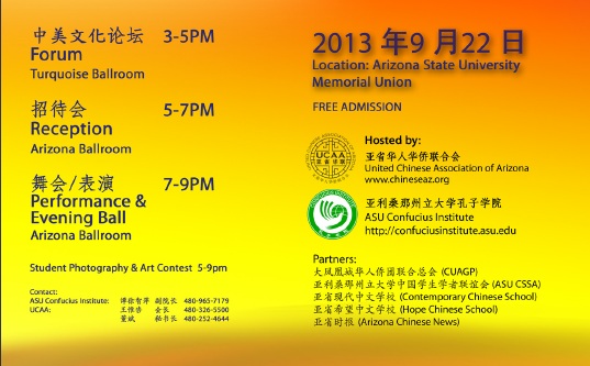 目前,由亚省华联和ASU孔子学院共同主办的第七届国庆-中秋《凤凰之夜》系列活动正在积极筹备进展中。与往年传统相同,今年,亚省华联将继续与ASU孔子学院共同主办主题为”中美合作面面观”的中美文化论坛。届时,美国国会议员、Honeywell公司亚太地区总裁和与我们背景相同的Intel华人明星将应邀到会做主题演讲。除中美文化论坛外,还将有很多精彩活动。。。。整个活动并由当地众多重要的华人社区团体和社团参与协办,其中包括大凤凰城华人侨团联合总会,亚利桑那州立大学中国学生学者联谊会,亚省现代中文学校,亚省希望中文学校,以及亚省时报等社团。 第七届国庆-中秋《凤凰之夜》系列活动的公告,以及印有亚省华联新注册会标的海报已经准备就绪。有关此次活动的更多详细内容,请登陆亚省华联网站http://www.chineseaz.org.