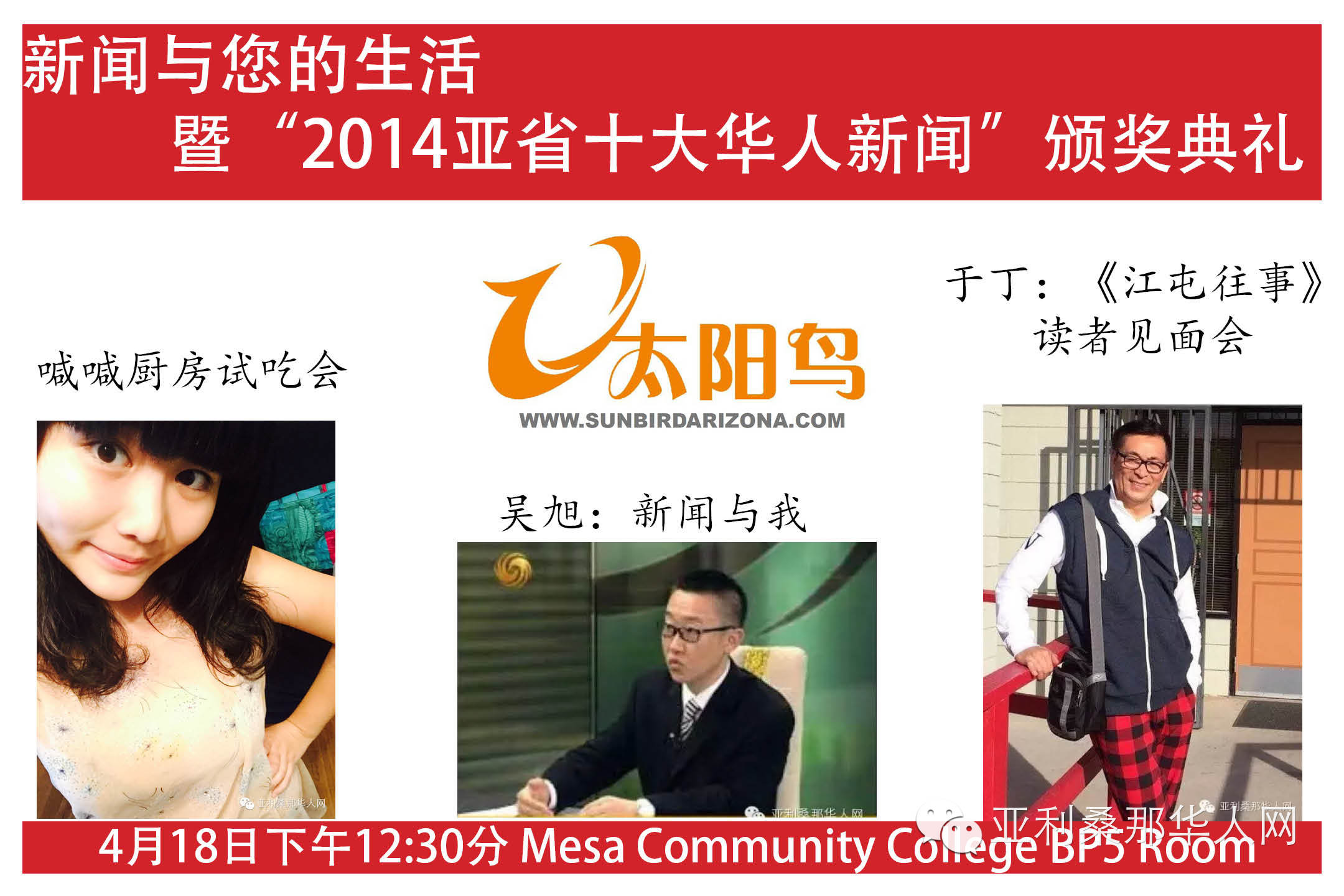 2014十大华人新闻评选圆满落下帷幕,我们相约”2015年十大华人新闻”颁奖仪式暨”太阳鸟”亚利桑那华人网五周年庆典活动,不见不散。