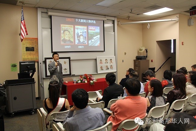 2015年4月18日”亚省十大华人新闻”颁奖典礼在希望中文学校隆重举办。亚利桑那州立大学吴旭教授,中国摄影家协会会员、中国新闻理事会会员丁允衍,美国好莱坞中文卫视台长 Steven Ding,亚省中餐馆协会会长张华芳,钱德勒市公共关系委员张圣仪,亚省艺术学院校长吕丽华,欣欣超市负责人赖甲乙,前全美中文学校协会会长 凤凰笔会会长帅致若,亚美报主编 孙涧萍都来到了现场,资深侨领尹衍桓送来了鲜花表示祝贺。近90当地读者相聚一堂。