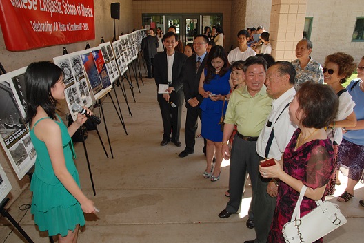 4月19日下午两点,老师、同学及贵宾们来到了活动现场。来宾包括有资深侨领余文劲,还有高志中、孙如新、黄国熙、邱顺雄、 张慧美、张圣仪、林子宣、张肇鸿、黄馨民、黄义成、余霭明、庄淑华、沉柏、闻玲琳等,以及华裔、非华裔的学生家长们。活动由学校顾问郑弘主持,他热烈欢迎各界嘉宾莅临,阐明了此次活动的意义。学校董事长谢健明致词,他提到这次筹备活动的过程,原本预期只是简单的图片展览,后来延伸到邀请贵宾、致词、剪綵等事项,让他觉得身负重任,一定要把这首次抗战图片展览办成功。然后,主持人邀请贵宾余文劲先生致词。余文劲先生说在日八年抗战期间,他人在大陆,亲身经历了战争的残酷和苦难,印象深刻难忘。他提到求学时环境很差,常常害怕敌机轰炸而停课。当时政府召青年参军,提出「一寸山河一寸血,十万青年十万兵」的口号。战争所带来的人、财物之损失难以估计,是对人类最残酷的事,他要学生们牢记战争带来惨痛的教训,要反对战争,并祝愿世界和平。