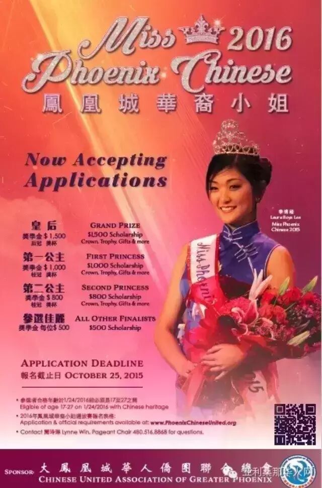 (侨联供稿)由大鳯凰城地区侨联举办的2016年凤凰城华裔小姐评选将于2016年元月二十四日举行,现在已经开始叝名,欢迎符合条件的华裔女青年踊跃报名。华裔小姐评选是鳯凰城侨联自1968年以来,为发扬中华文化和为优秀青年举办的传统活动。