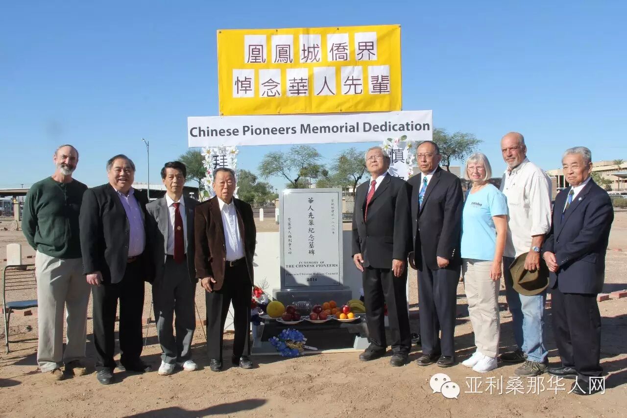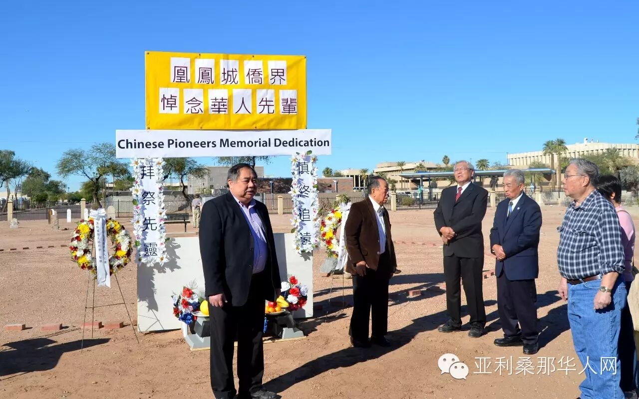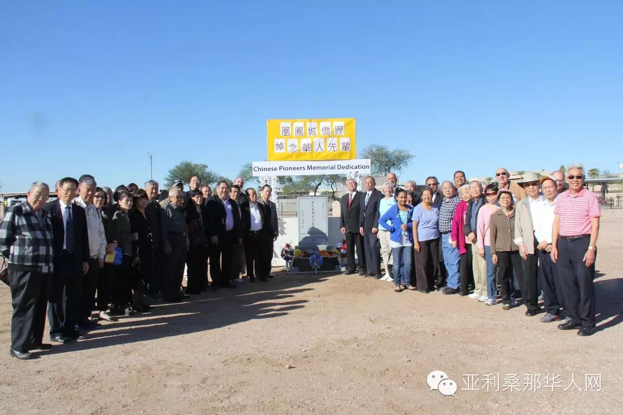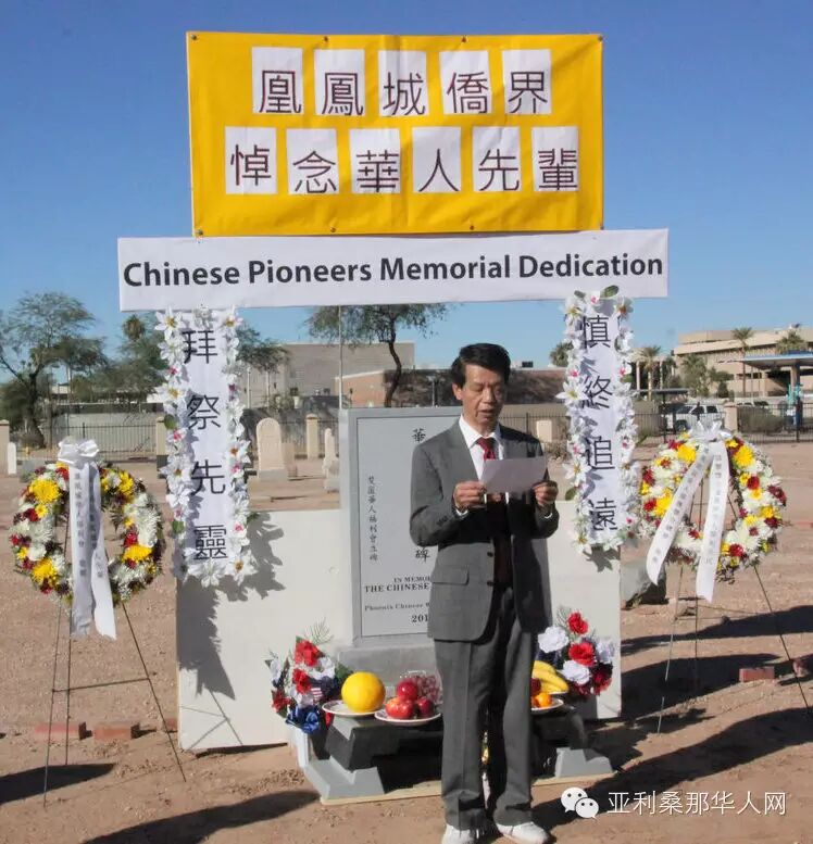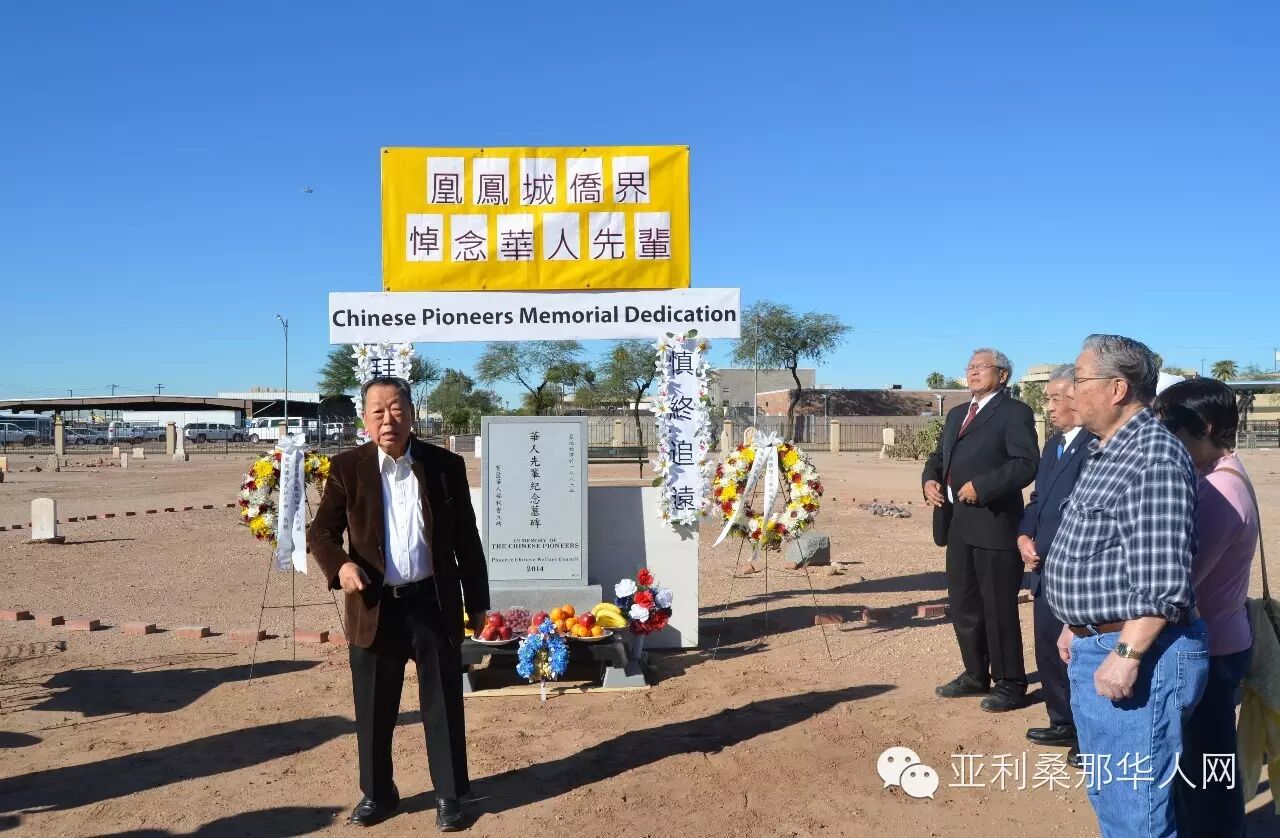 接着,由本埠资深侨领余文劲先生致辞。他说,这华人墓地由唐孝先先生提供资讯,由张肇鸿先生跟进深入调查并获得成果,由华人福利会建立起先民纪念墓碑,这是华人侨界为我们的华人先辈做了一件功德无量的好事,今天凤凰城侨界举行公祭纪念,今后这里的华人开拓者再不会被人遗忘。凤凰城侨联总会主席余文泽随后发言,他肯定华人先民对美国社会的贡献,今天大家拜祭先灵,纪念他们,更要面向未来,让华人发挥更大的作用。公祭仪式完成后,全体来宾在华人纪念碑前合照留念,并由福利会领导们自行出资,邀请大家到六福酒家共进午餐。