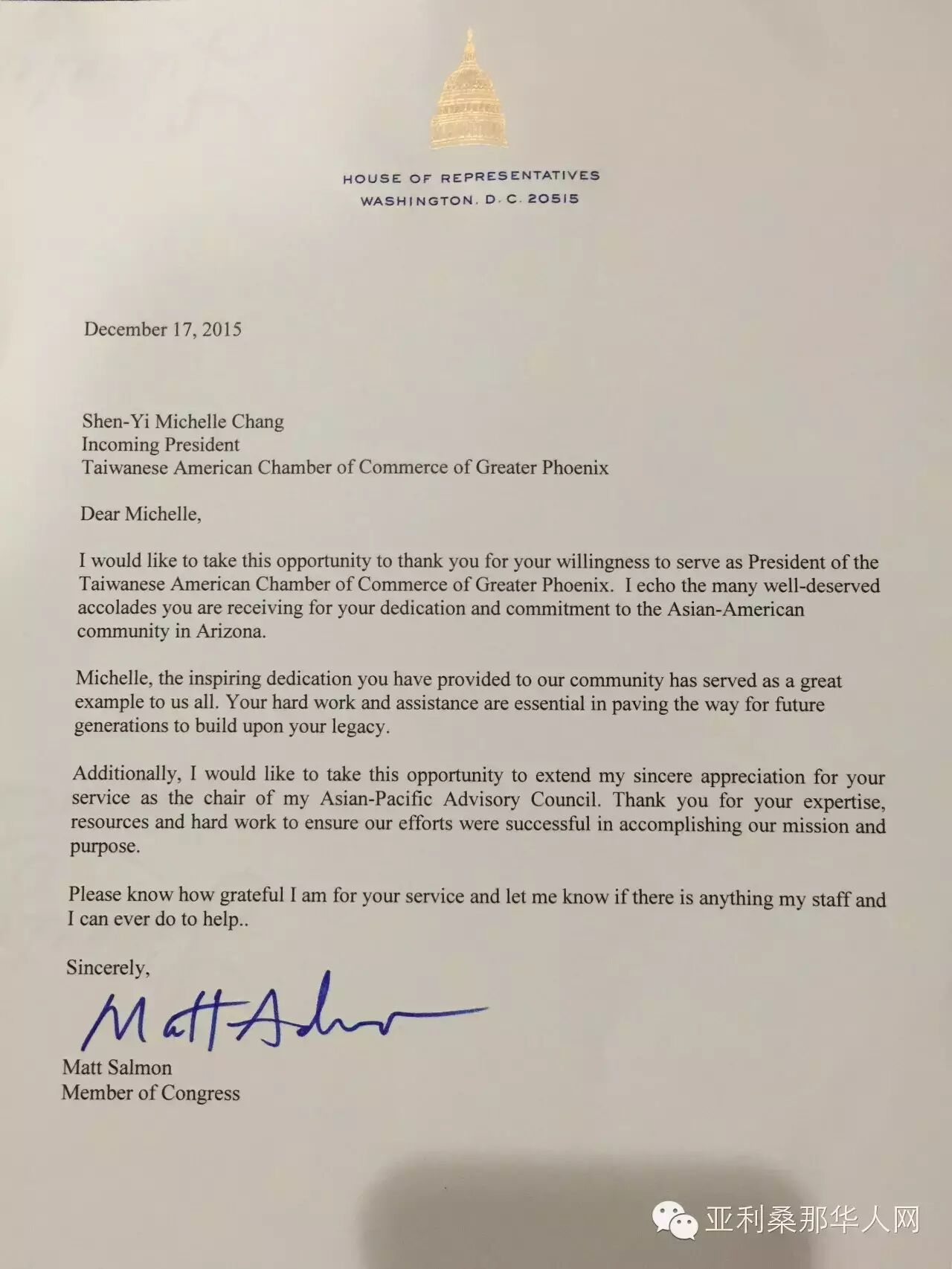 大凤凰城台美商创立于1999年,迄今已迈入第十七个年头,在就职典礼中,创会会长萧时英致词时介绍商会创会宗旨,历史沿革及对未来期许,并代表中华民国侨务委员会陈士魁委员长致赠感谢状给卸任会长张晴玲侨务谘询委员及贺状给新任会长张圣仪侨务促进委员;大凤凰城台美商会理事黄玉莲侨务顾问,则代表中华民国驻洛杉矶经济文化办事处夏季昌处长,致赠感谢状给卸任会长张晴玲及贺状给新任会长张圣仪。现任美国国会联邦参议员暨前美国总统候选人麦肯John McCain, 美国国会联邦众议员Matt Salmon, 美国国会联邦众议员Paul Gosar, 亚利桑纳卅卅长Doug Docey, 卅务卿Michelle Reagan, 钱德乐市长Jay Tibshraeny 均派办公室代表Ana Pereira,Lee Huff,Tom Flin, Barry Wong, Teresa Martinez 出席亦分别致赠贺状。