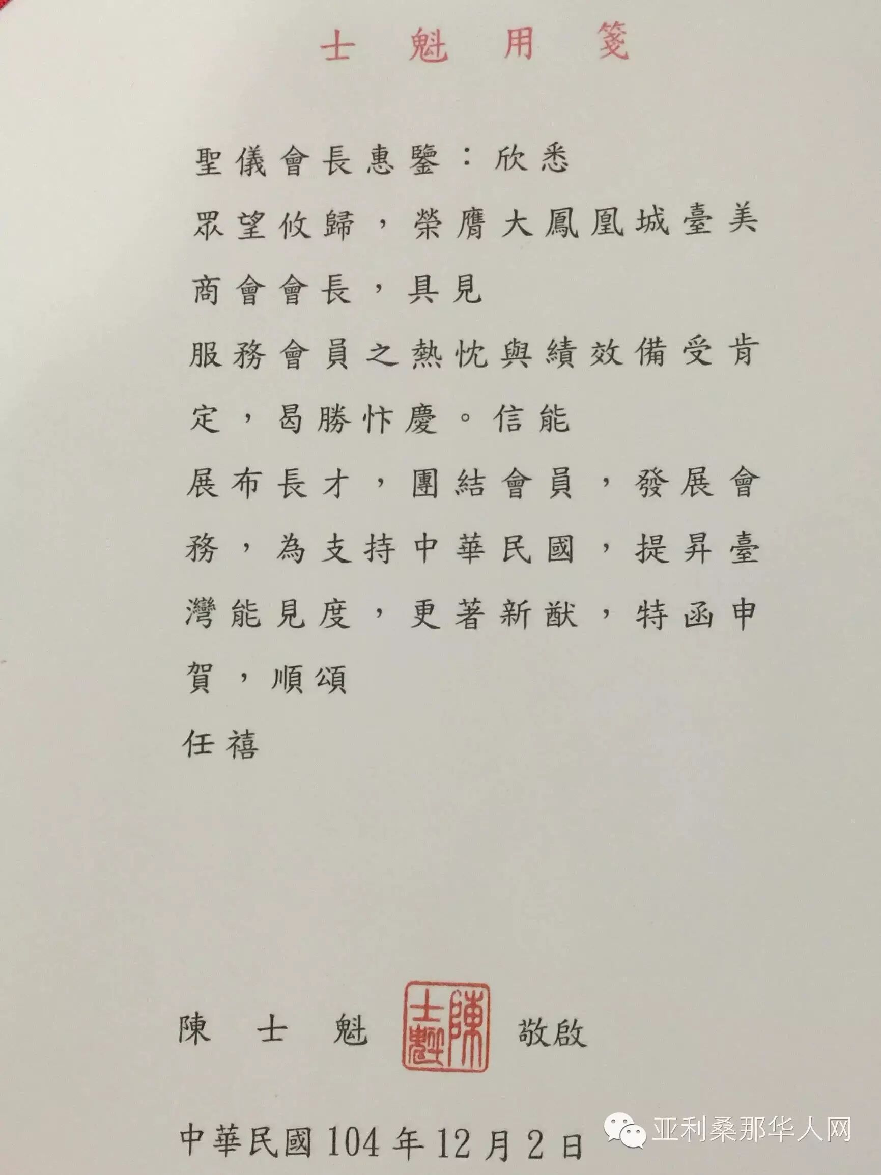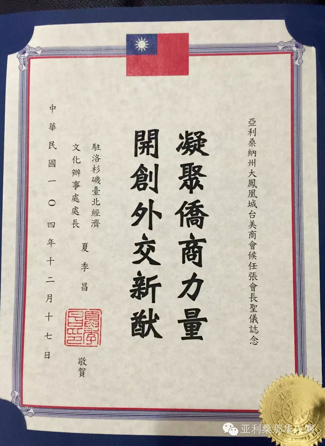 大凤凰城台美商于十二月十七日晚上六时在美国亜利桑纳卅钱德乐市红宝石餐厅,举行年度理事会员大会暨第五,第六届会长交接晚宴。现任会长张晴玲在钱德乐副市长Kevin Kartke的见证下,将印信交接给新当选会长张圣仪,在所有理监事会员,主流政要,各族裔商会会长见证下,完成简单隆重的交接就职典礼。