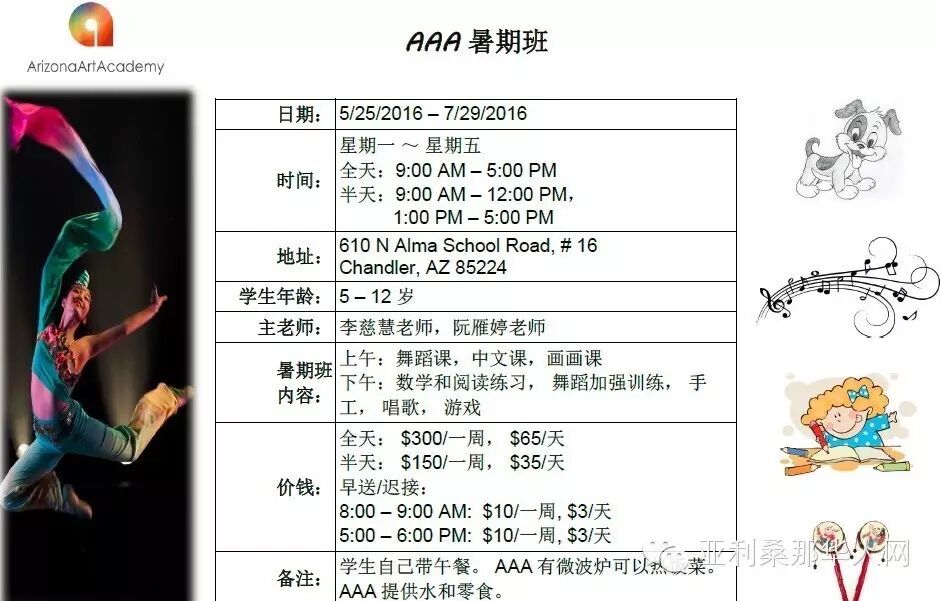 亚利桑那的炎炎夏日,让孩子和家长都很难熬,长达两个月的假期,让孩子们怎样度过一个有意义的暑假呢?亚省艺术学院特别开办了艺术暑期班。您的孩子可以学习中文,数学,舞蹈,唱歌,绘画。认识新朋友,辅导功课,提高艺术素养。更多有趣的课程马上送到。
